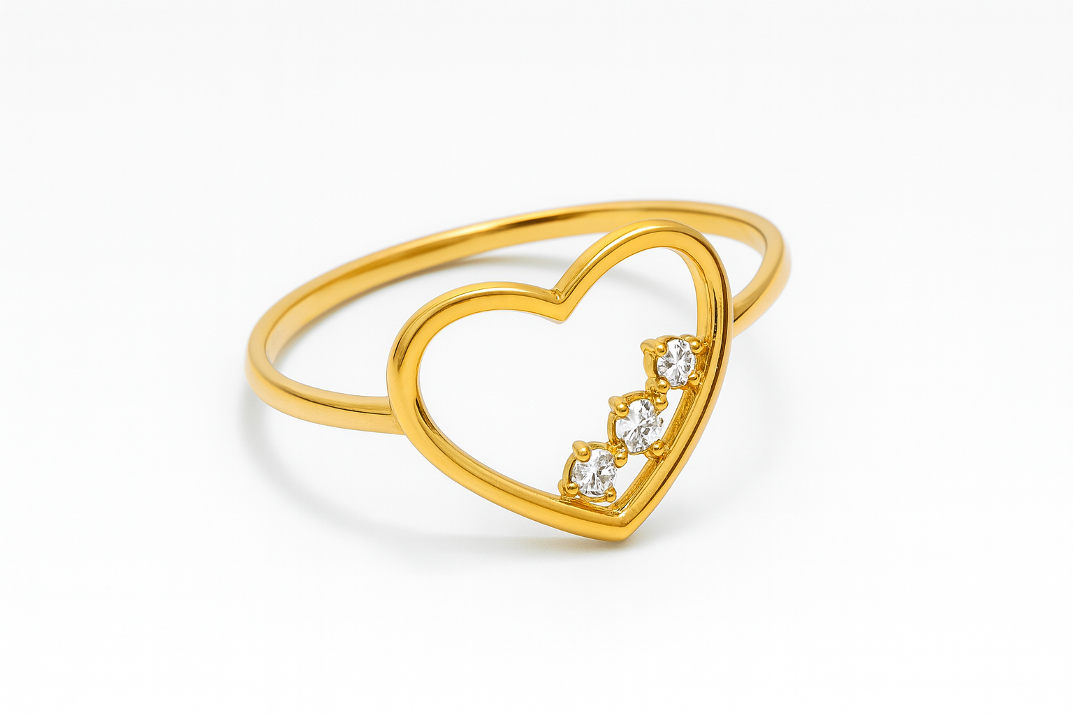 Anel coração vazado em ouro 18k com 3 zircônias.