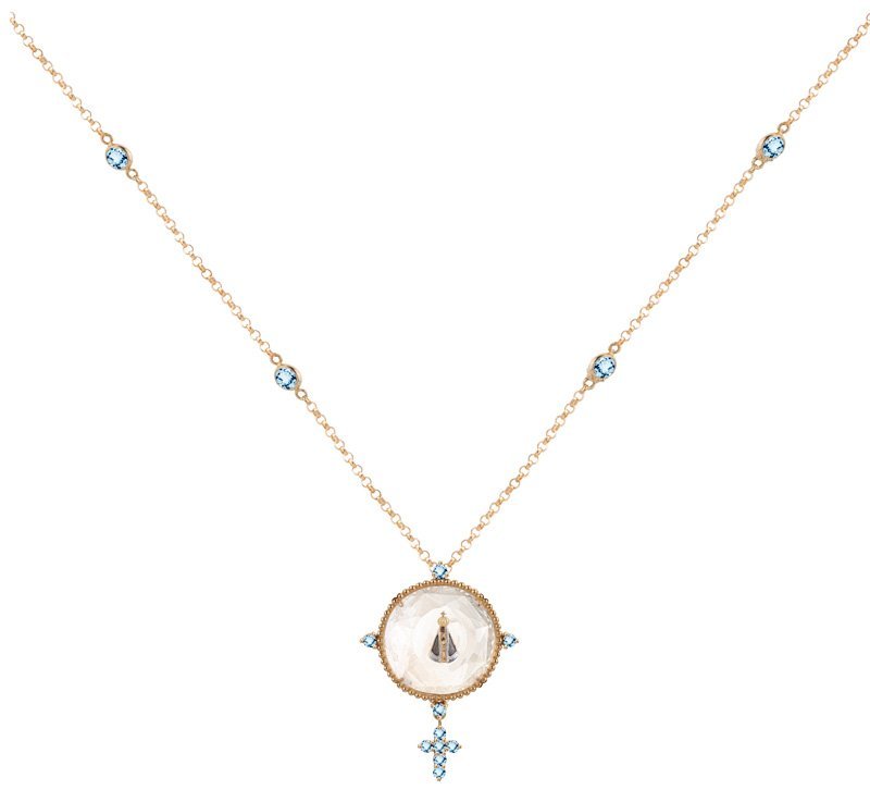 Gargantilha Nossa Senhora Aparecida com corrente elo português de 45cm em ouro 18k com cristal e topázios sky.
