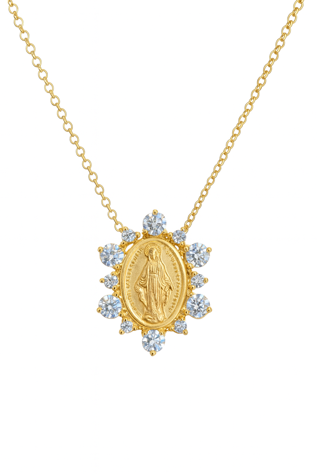 Gargantilha Nossa Senhora das Graças com corrente elo português de 40/45cm em ouro 18k e zircônias.
