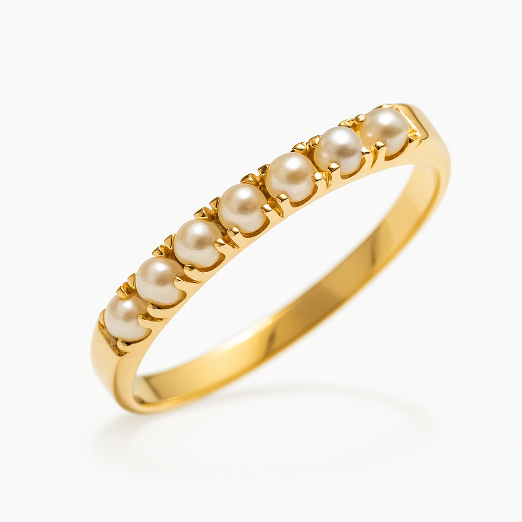 Meia aliança em ouro 18k com 8 pérolas.