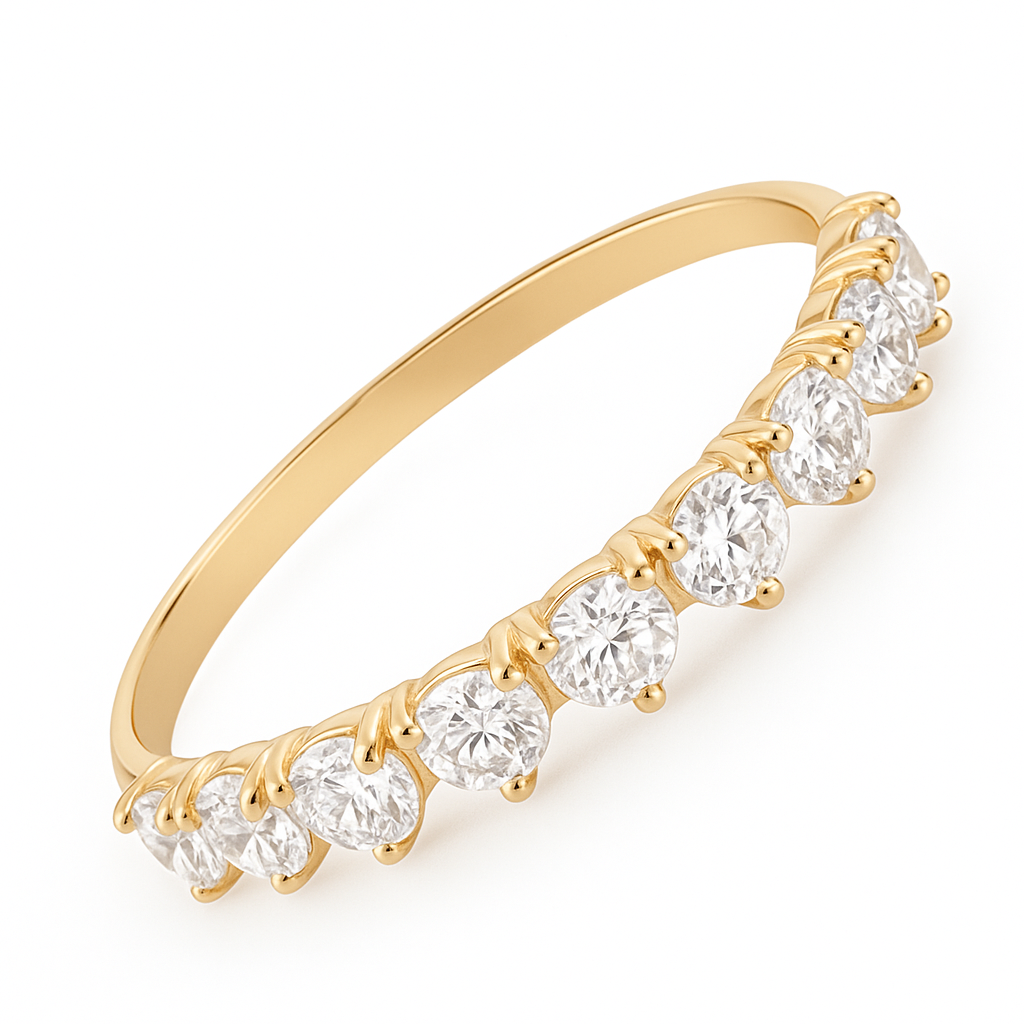 Meia aliança com 9 zircônias de 2.5mm em ouro 10k.