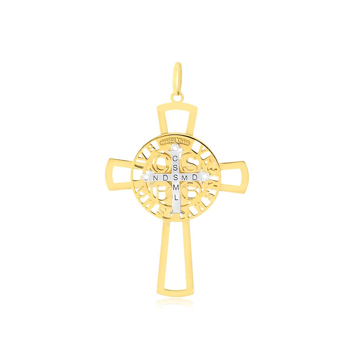 Pingente cruz São Bento G em ouro amarelo 18k e ouro branco.