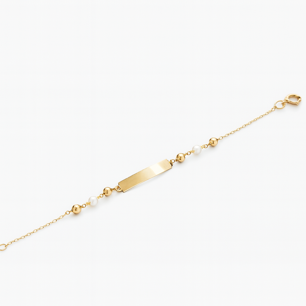 Pulseira de 13cm com placa e bolas em ouro 18k e pérolas.